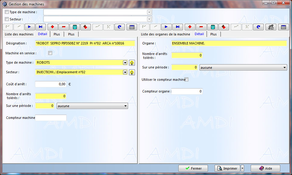 - Les machines sont caractérisées par un code machine, un nom, un emplacement, etc... Pour chaque machine, des organes peuvent être définis.